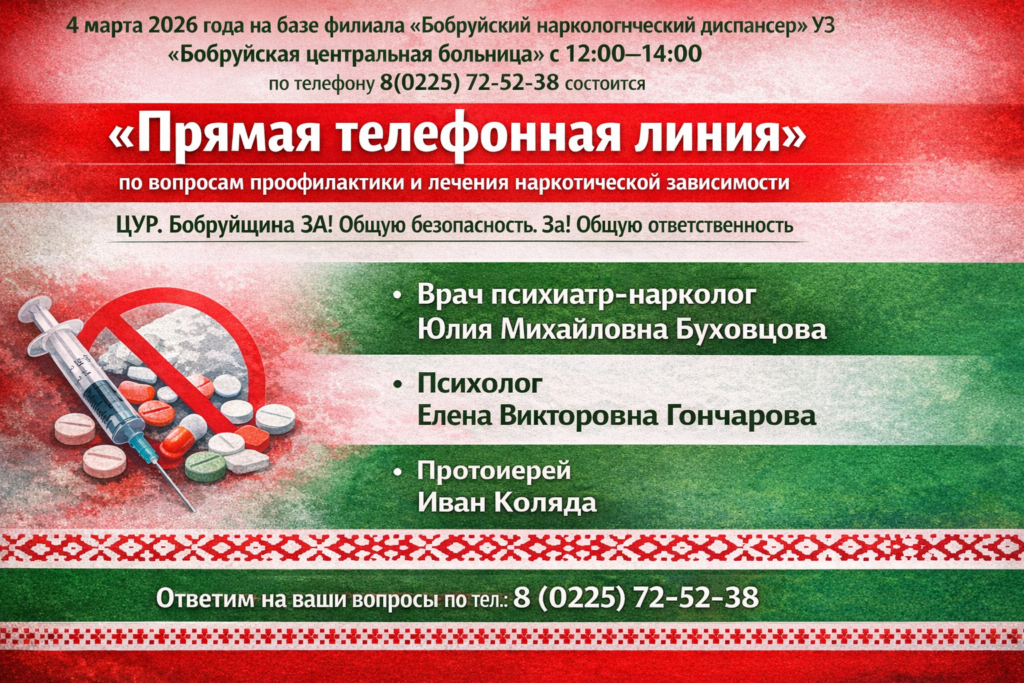 4 марта 2026 года на базе филиала «Бобруйский наркологический диспансер» учреждения здравоохранения «Бобруйская центральная больница» с 12:00-14:00 по телефону 8(0225) 72-52-38 состоится «Прямая телефонная линия» по вопросам профилактики и лечения наркотической зависимости, оказание помощи наркозависимым в рамках информационно- профилактической акции «ЦУР. Бобруйщина ЗА! Общую безопасность. За! Общую ответственность»